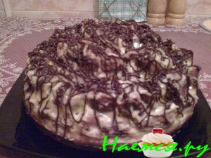 как все выложили,глазурь выливаем в целлофановый пакет,отрезаем чуть-чуть кончик пакета и обливаем кругообразными движениями торт.