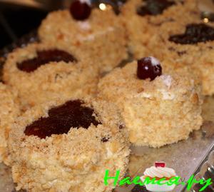 10.Смазываем верх пирожных кремом .Я варила помадку ,окунала в нее вишни и укладывала на пироженки.Некоторые пирожные полностью покрыла помадкой.