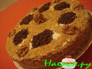 Нагреть сироп вместе с маслом. К остывшему сиропу добавить пряности, взбитые яйца, сметану, смешанную с содой муку. Вылить тесто в круглую форму, разровнять и выпекать в духовке со средним жаром 30 мин. Охлажденный корж разрезать на 2 или 3 части.