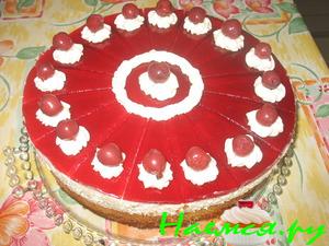 Половину теста выкладываем на противень хорошо равняем,в другую половину добавляем какао и хорошо перемешиваем,и также выкладываем на противень и хорошо равняем.Сверху выкладываем вишню(предварительно слив с нее сок). Выпекаем в предварительно нагретой духовке примерно 20 минут при температуре 200°C.