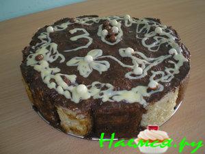 В форму сначала выложить самое большое кольцо белого коржа, потом второе по величине кольцо темного коржа, потом третье по величине кольцо белого коржа, потом четвертое по величине кольцо темного и пятое по величине кольцо белого.