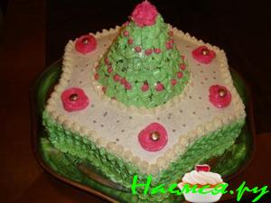Выпекать при температуре 200 градусов в заранее разогретой духовке около 8 минут. До коричневого цвета. Взбить сметану с сахаром для крема. Промазать кремом коржи. Украсить по своему усмотрению .У нас получилась елка.