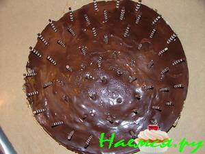 16. Ставим в холодильник на 1 час. После охлаждения поверхность торта покрываем шоколадной глазурью.