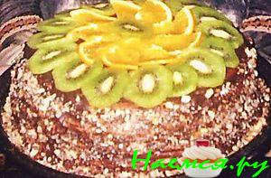 Всё смешать, разделить на 3 части,выпечь коржи(пекутся минут по 10,но всё равно лучше проверять зубочисткой,