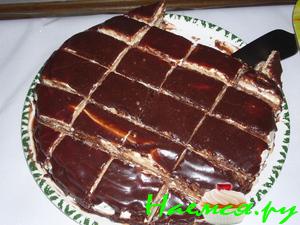 Замесить тесто без какао, разделить на две части, в одну добавить какао. Выпекать 3 белых и 3 тёмных коржа.