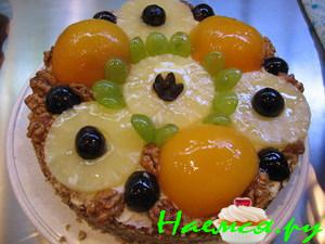 Остывший корж смазываем кремом,на середину кладём фрукты,затем накрываем вторым коржом и полностью покрываем кремом и украшаем тёртым шоколадом.