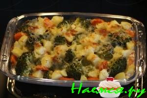 Брокколи и спаржу отварить и поджарить на подсолнечном масле, а также паралельно этому обжарить на подсолнечном масле лук и помидоры на отдельных сковородках.Отварное куринное мясо порезать на кусочки. Все это выложить в форму для выпекания, предварительно смазанную подсолнечным маслом поочередно: брокколи,лук,помидори,мясо,лук,помидоры,брокколи.
