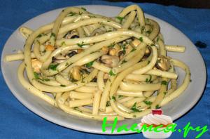 Макароны отварить в подсоленой воде до готовности (очень важно не переварить). Воду слить.