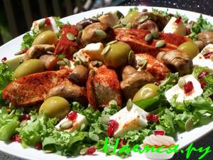 Укладываем на тарелочку грибы+маслины+куриную грудку .На куриную грудку выкладываем огуречный соус посыпаем порезаной черемшой.
