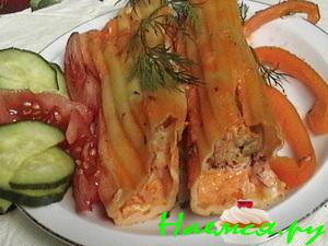 заливаем фаршированные каннеллони соусом и ставим в духовку на 30 мин
