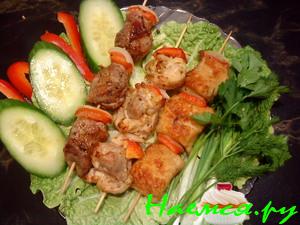 Нанизываем на шпажки чередуя язык,перец,помидор,лук.
