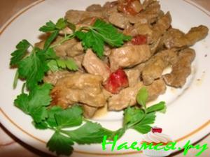 На разогретой с маслом сковороде обжарить сначала свинину, затем добавить печень, лук, чеснок и тоже обжарить.