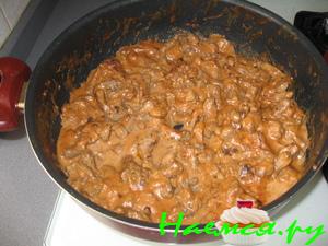 Положить к мясу лук и влить соус,довести до кипения,добавить по необходимости соль и перец и можно с аппетитом кушать.На гарнир-картофельное пюре,рис,овощи.