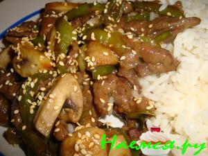 В том же масле, в котором жарилась говядина, обжарить лук. Затем влить в сковородку соевый соус с водой и тушить лук минут 5.