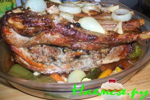 4.Натереть лук на мелкой терке, перемешать с солью и перцем и натереть этой смесью мясо,облить горячим маслом и жарить в заранее нагретой духовке в течении 1часа.
