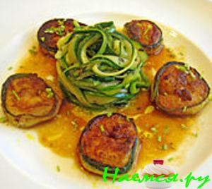 Для фарша пропустить телятину с луком через мясорубку, добавить сметану, горчицу, приправы. Вымесить. Намазать равномерно на кабачковый корж и с помощью бумаги свернуть рулетом. Плотно завернуть в эту бумагу и фольгу. Запекать при 180 градусах 30-40мин.