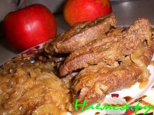 В тарелку выкладываем соус,сверху кладем кусочки мяса и кушаем на здоровье!