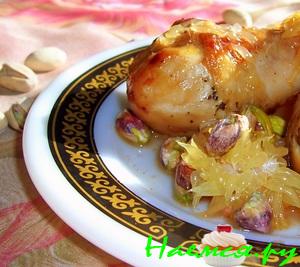 Луковицу мелко нарезать. В миске смешать лук, горчицу, паприку, добавить сок и вино. Как следует размешать, посолить, поперчить, добавить любимые специи и растительное масло. В этой смеси замариновать куриные голени. (можно бёдрышки)