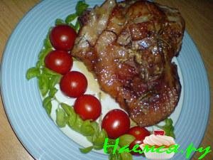 Фаршированную голень уложите на противень с растопленным салом, запекайте 1,5 часа при 180*, периодически поливая выделяющимся соком.