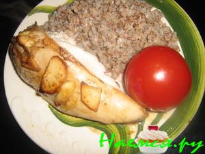 Положить начинку в " куриные кармашки" и заколоть зубочисткой.