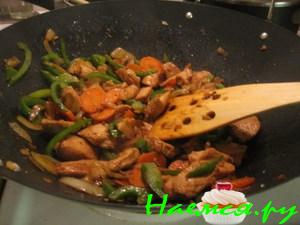 соусом "Тирияки" и специями. Обжарить, убавить огонь , накрыть крышкой.Перец нарезать полукольцами, лук перьями(вдоль луковицы),морковь нарезать соломкой, добавить к утке вместе с маринадом, обжарить еще в течении 10-15 минут, чтоб не выпарился весь соус . Выложить фунчозу, сверху овощи и утку с соусом , посыпать обжареным кунжутом и подавать к столу.