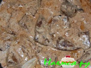 Вылить соус на печень и потушить 3-4 минуты.
