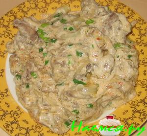Печенку нарезаем соломкой и к овощам. Немного обжарим на сильном огне.