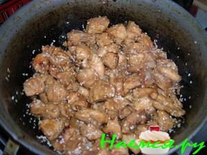 В сковороде нагреть масло, обжарить лук до мягкости. Увеличить огонь, добавить грудки, подрумянить.