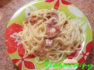 Слегка взбить желтки,ввести сливки и сыр,перемешать.Посолить и поперчить.Добавить к бекону с грибами,На медленном огне быстро помешивая довести до кипения.Не увеличивать огонь,иначе желтки "схватятся",чего допускать нельзя.