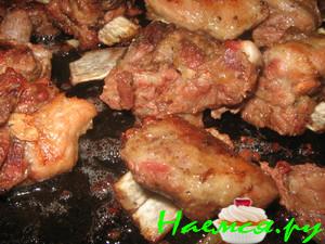 В форму укладываем яблоки, сверху рёбрышки и поливаем остатками медовой заливки.