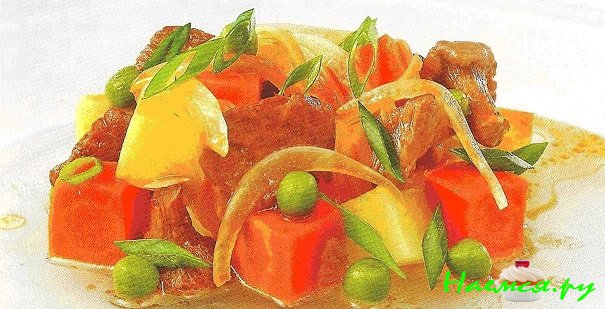 3) Добавьте нарезанные кубиками картофель и морковь, зелёный горошек и тушите овощи на слабом огне 20 минут