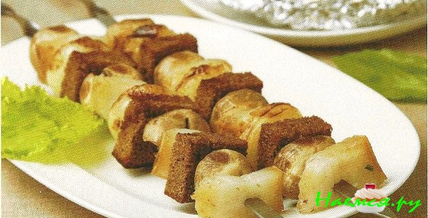 2) Нанижите на шампуры грибы, чередуя их с луком, шпиком и хлебом