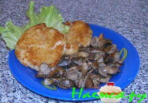 Лук почистить и мелко нарезать. Поставить на плиту сковородку, налить масла и обжарить порезанный лук до золотистого цвета. Грибы хорошо промойте, зачистите и мелко нарежьте. Добавить грибы к луку, посолить и тушить ингредиенты на маленьком огне примерно десять минут. Помешивать нужно периодически и тушить до того момента, пока не испарится влага. Куриное филе хорошо промыть и нарезать небольшими кусочками и перемолоть на блендере, в готовый фарш добавить соль, перец и одно яйцо. Остальные яйца слегка взбить венчиком, добавить панировочных сухарей и перелить кляр в небольшую миску. Готовый фарш нужно разделить на шесть частей. Сформируйте из одной части небольшую лепешку, положите немного начинки и заверните плотно в виде котлетки, при этом тщательно закрепляйте концы. И так проделайте с остальными частями фарша. Опустите котлету в панировку и придайте идеальной формы. Поставьте сковородку, налейте масло, разогрейте и обжаривайте зразы со всех сторон, затем переложите в форму для запекания, которую заранее смажьте постным маслом. Разогрейте духовой шкаф до 180 градусов и запекайте зразы на протяжении двадцати минут. Подавать зразы можно с любым гарниром и при подаче украсить зеленью и сметаной.