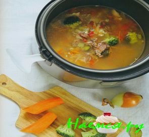 • Сложите в чистую чашу MB мясо и овощи. Лук и морковь положите целиком. Говядину нарежьте на крупные куски, окорочка оставьте целыми. Если рулька или ножка помещаются в чашу, их тоже оставьте целыми, если же нет - разрубите на две части.