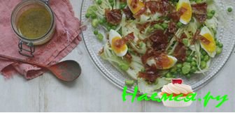► Бланшируйте бобы в кипящей воде 3-Д минуты до мягкости. Бросьте в миску с ледяной водой, откиньте. Вылущите бобы из стручков. Добавьте к горошку и отставьте в сторону.