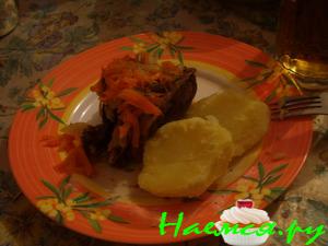 затем темпер.убавить до 180 град.добавить вино и оставить ещё на 1,5 часа..в процесе готовки если не достаточно жидкости,подливайте воды что бы мясо не пересыхало...