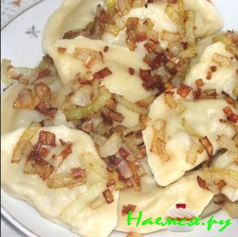 Из муки, воды и соли (можно добавить немного растительного масла) замесить тесто. Слепить большие вареники (15 шт.), чтобы в каждый поместилось по 1 ст.л. начинки. Опустить в подсоленный кипяток, осторожно перемешать, варить на малом огне 12-14 мин. после того, как всплывут. Подать с соусом из кипяченой воды, толченого чеснока, соли и молотого черного перца.