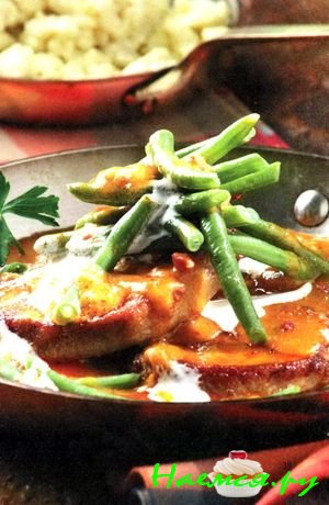 Аккуратно отбейте ломтики мяса, посолите, поперчите. Обжарьте на жире мелко нарезанный лук, затем положите ломтики мяса и добавьте немного воды, потушите ломтики под крышкой. Когда мясо будет почти готово, добавьте тонко нарезанные овощи, немного красного молотого перца и лавровый лист. Когда овощи станут мягкими, можете добавить 50 мл белого вина, выпарить жидкость и обжарить мясо с оводами. Затем присыпьте мукой, перемешайте и добавьте сметану. Приправьте горчицей (1 ч. л.) и при необходимости долейте воды. Соус должен быть желтого цвета. При подаче на стол посыпьте блюдо мелко рубленой зеленью петрушки.