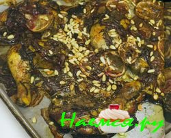 3. Переложите цыпленка кожицей вниз вместе с маринадом на большой противень и поставьте его в духовку на 35 минут.