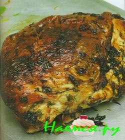 2. Положите грудинку на противень шкуркой вниз, слегка посыпьте солью и перцем. Руками распределите смесь из трав по всей поверхности свинины так, чтобы она хорошенько прилипла к мясу.
