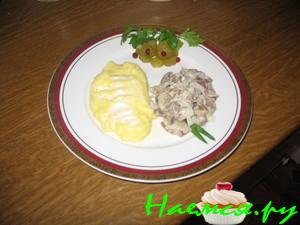 Тем временем лук порезать полукольцами и замариновать в уксусе,сахаре,сольке на 20 минут.
