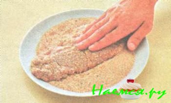 7. Обвалять в панировочных сухарях, при этом слегка придавливая рукой. Лишние крошки осторожно стряхнуть.