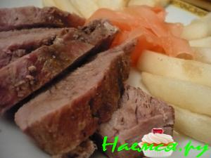 - Замаринованную мякоть аккуратно завернуть в фольгу и положить ее на противень. Противень отправить в предварительно нагретую духовую печь на полтора часа.