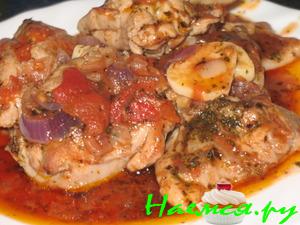 На оставшемся масле потушить лук и мелко нарезанные огурцы, влить томатный сок от помидор, заправить специями, добавить 1ст.л сахара, дать покипеть 10мин.