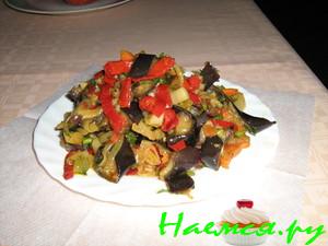 баклажаны, перец, помидоры порезать кубиками. выложить в кастрюлю где блюдо будет готовится.