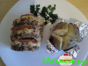 В куске свинины сделать надрезы (не доходя до конца), толщиной около 1 см.Сыр порезать пластиками толщиной 3-4 мм.Помидоры порезать кружочками.Чеснок порезать пластиками.Свинину посолить, поперчить (в надрезах тоже).В надрезы положить сыр, помидор, чеснок.Завернуть свинину в фольгу,вокруг можно наложить картошки.Посыпать всё это дело укропчиком и перчиком.И отправить в духовку на часок.За минут 15 до готовности желательно открыть фольгу,что-бы мяско зарумянилось.