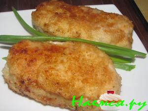 Яйца посолить и поперчить, взбить вилочкой, сухари насыпать в тарелочку.