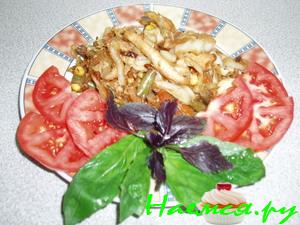 тем временем имбирь помыть, почистить, тонко нарезать соломкой (толщиной 2-3 мм.), и замочить в воде на 5-7 мин. затем воду слить .