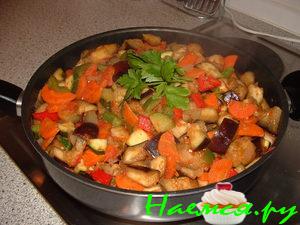 Порезать все овощи не крупно,каждый овощь отдельно и посолить слегка .Мяско порезать посолить и натереть чесночком .