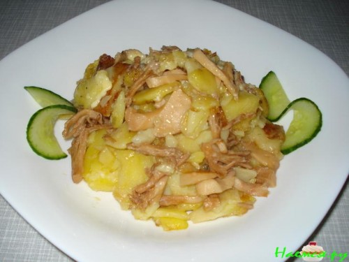 Когда картофель будет готов смешасть его с грибами,посолить,поперчить и пару минут жарить.Затем выложить в форму,полить майонезом и вырекать в духовке 10 минут.